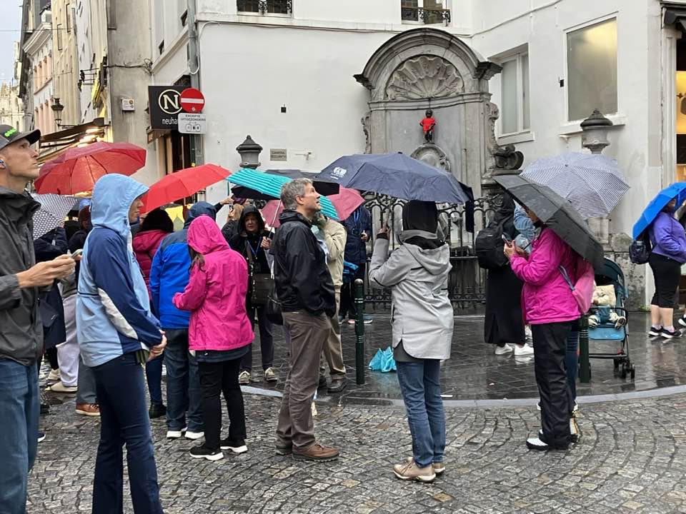 A large crowd watching a statue of a small boy urinating–this world famous tourist attraction is called “Manneken Pis.”