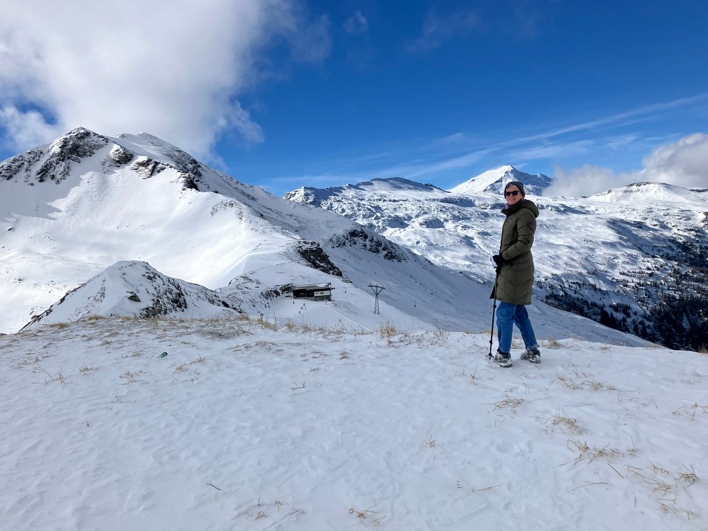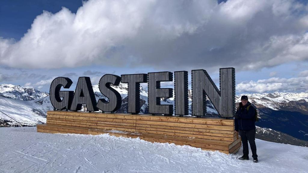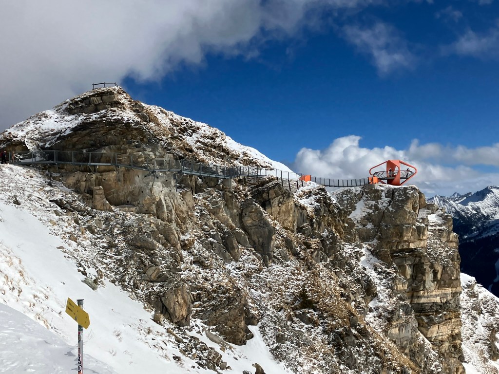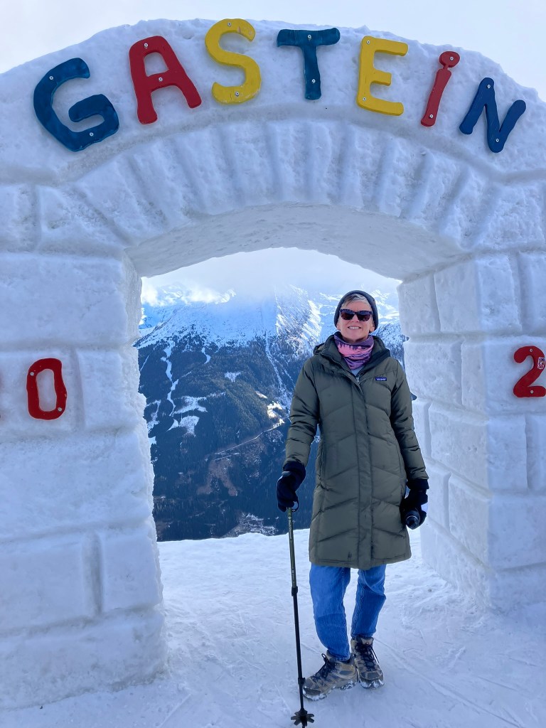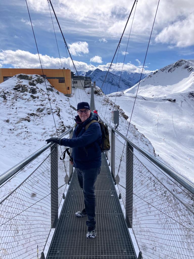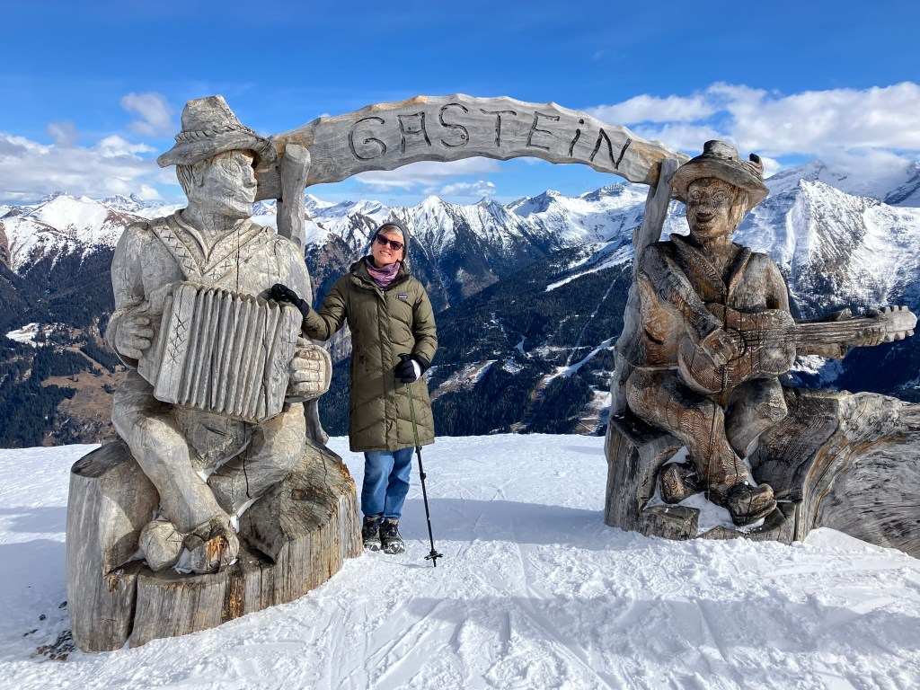 And then there are the mountains. The town is in a mountain valley. While there are a number of mountain peaks, the center of the action is Stubnerkogel, which is 2,246 meters tall. Its summit is accessed by two gondolas and a few chairlifts as well. We were one of the few visitors who were not there to ski. Rather, we went up with our hiking boots, “cramp-ons”, trekking poles, and were able to hike around the summit a bit. There are a number of fun features for the non-skiers, like self-promoting signs to pose in front of (see sampling below), some Jetsons-like viewing decks, a cozy restaurant, and one of Europe’s highest suspension bridges. And, of course, the breathtaking views.